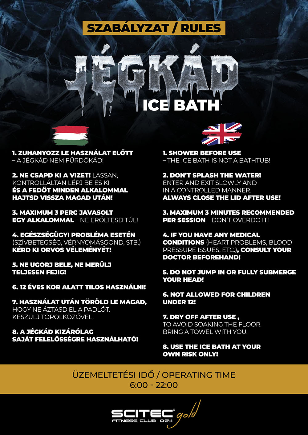 Használat előtt MINDENKÉPP OLVASD EL a lenti szabályzatot, melyet kifüggesztve is megtalálsz a jégkád mellett.